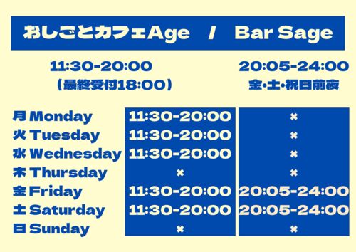 2023年3月31日より下記の通り営業時間を変更いたします。 おしごとカフェAge 受付時間 11:30~18:00(通常閉店20:00、入店時に申告で延長可能) 木・日 定休 Bar Sage 営業時間 20:05~24:00 金・土・祝前日のみ通常営業 変更内容について カフェタイム・バ…